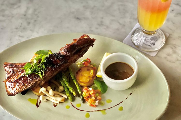 Rahang Tuna Panggang tampil menarik dengan glaze mengilap, fondant potato, asparagus hijau, dan jamur simeji. Dua saus yang menyertainya juga tidak sembarangan—rendang reduction dan dabu-dabu bakar arang. Keduanya menjadi kunci keseimbangan antara gurih, pedas, dan smoky.